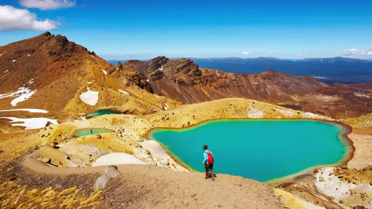 The Tongariro Crossing track ventures between Mt Tongariro and Mt Ngauruhoe in the Tongariro National Park and is considered one of New Zealand's greatest hikes. The track includes moonscapes, scoured volcanic rocks, lava flows frozen in time, mountain springs and brightly coloured emerald lakes with breathtaking views as far as the eye can see.