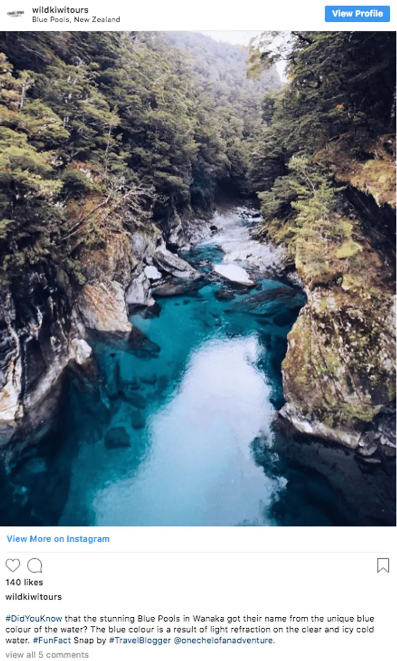 A little less-known NZ top Instagrammable location is just outside Wanaka are the Blue Pools; these pools of deep, pristine water flow in the Makarora river and offer a moment of tranquillity for yourself and your Insta-feed.